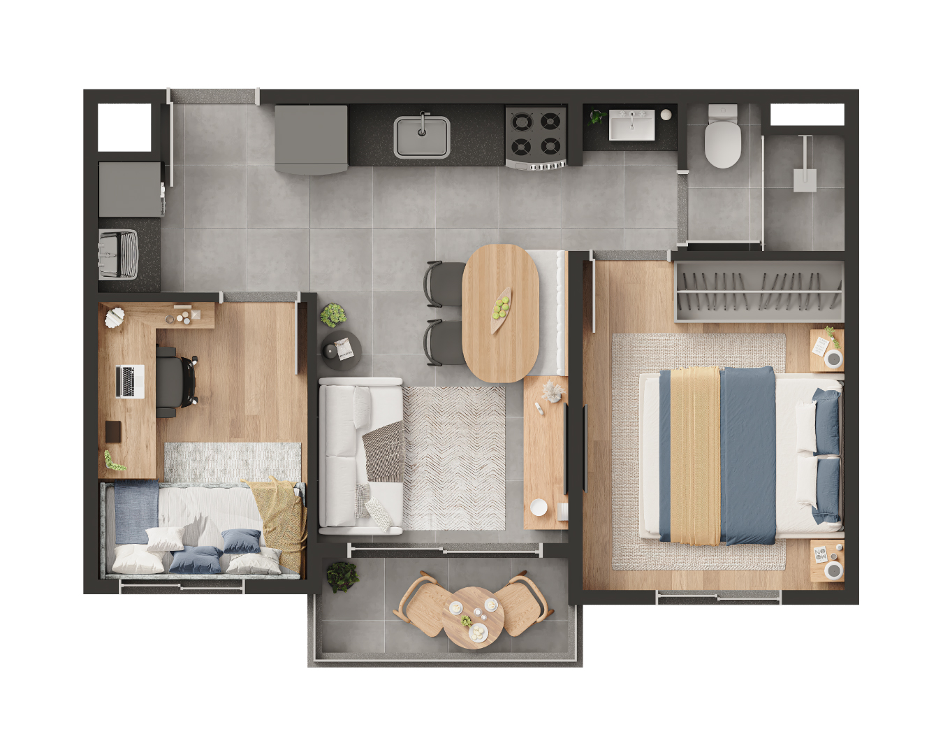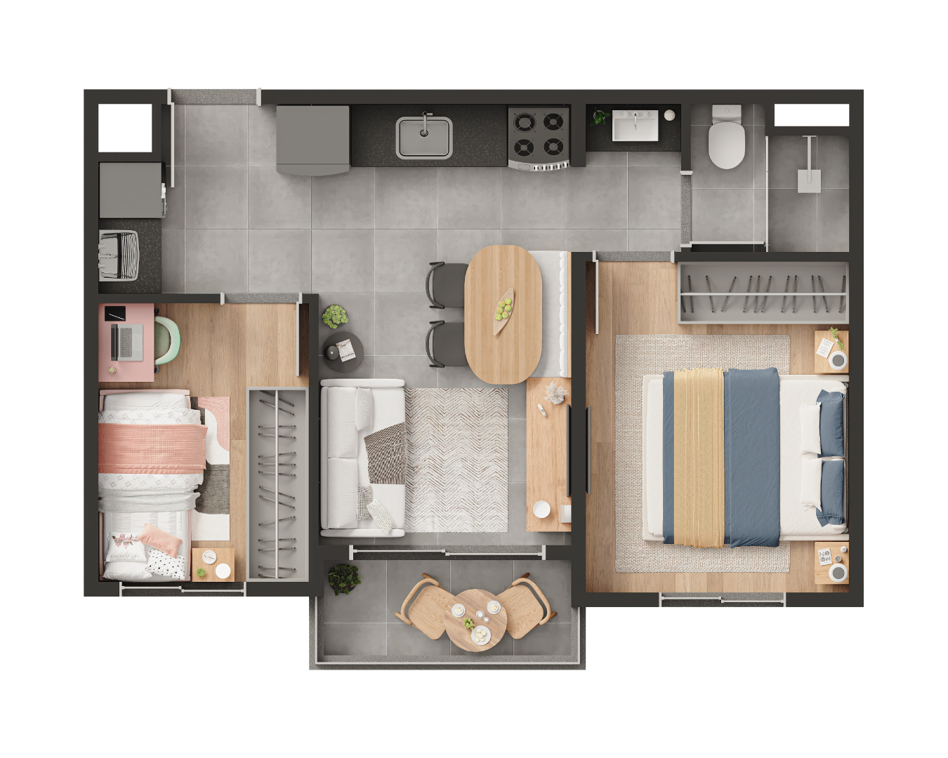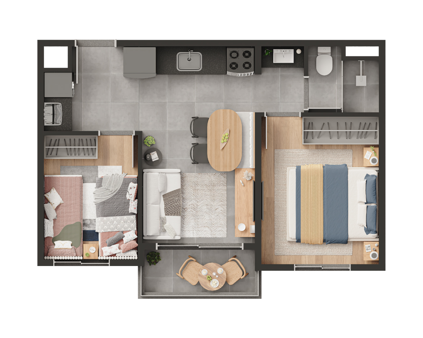 TIPOLOGIA: 2 dormitórios com opção de sala ampliada, 1 banheiro, sala, varanda, área de